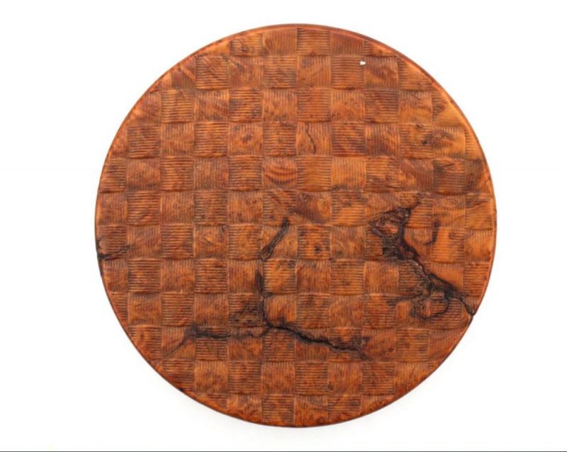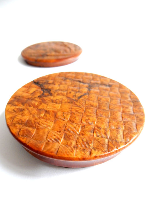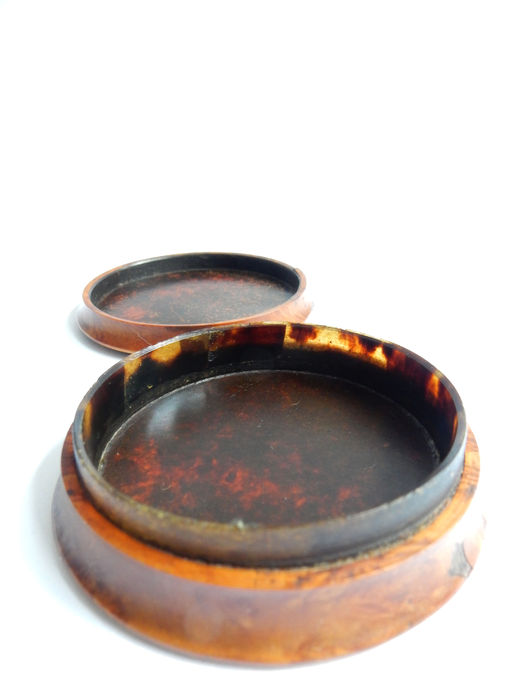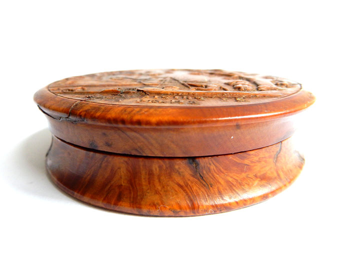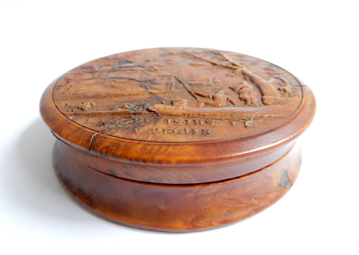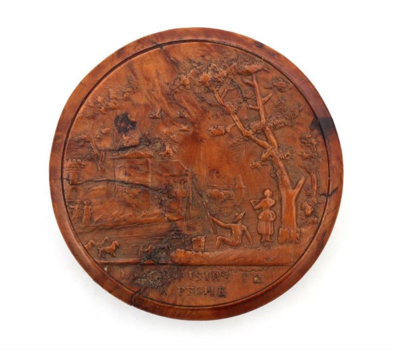 A maple or thuja burl wood snuff ox with a relief of a rural scene ‘Les plaisirs de la pêche’, the inside horn.