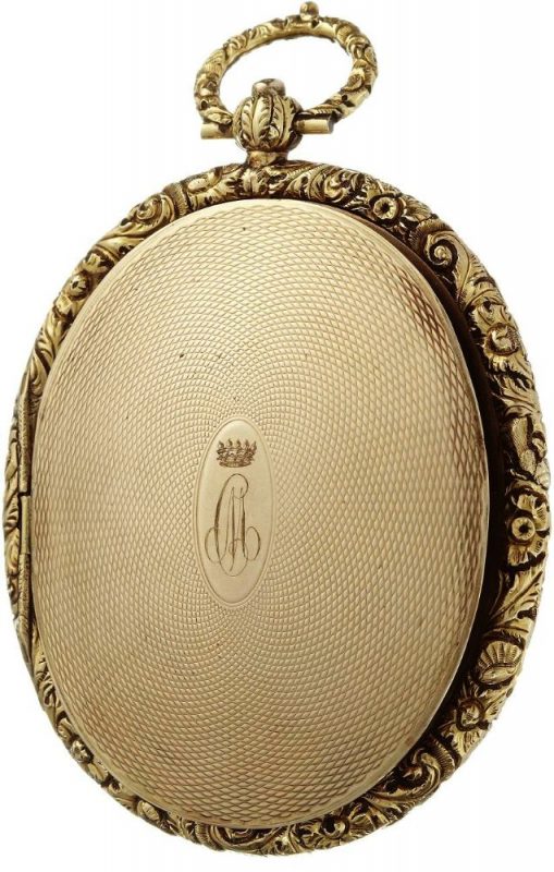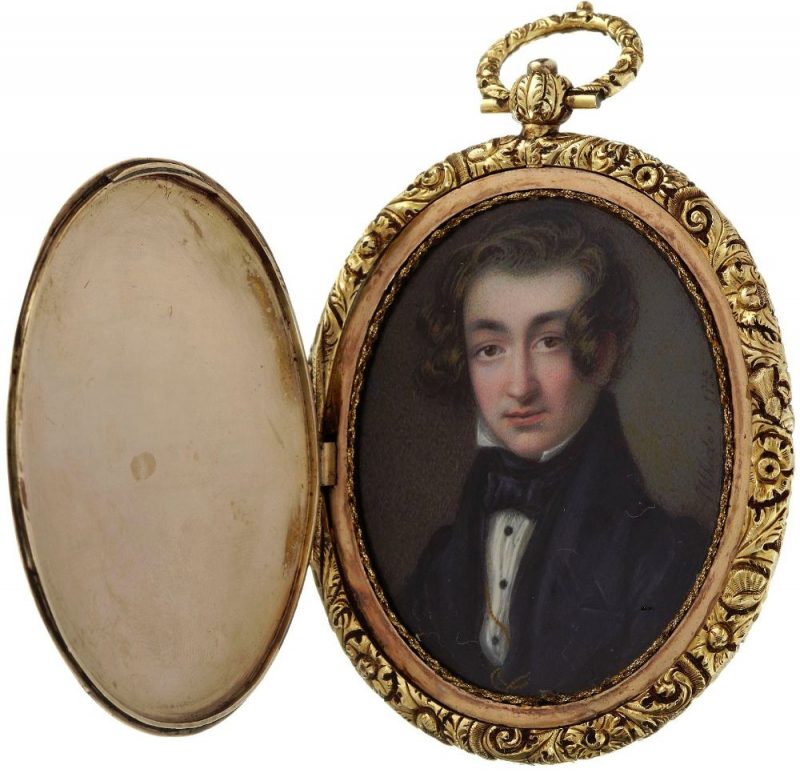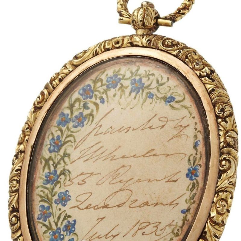 In the original gold locket, the lid guilloché engraved and in the centre with the initials CM under a Continental baron’s coronet, the reverse with handwritten inscription on a label under glass “painted by / Wheeler / 55 Regent / Quadrant /July 1835” and surrounded by a border of forget-me-not flowers in watercolour